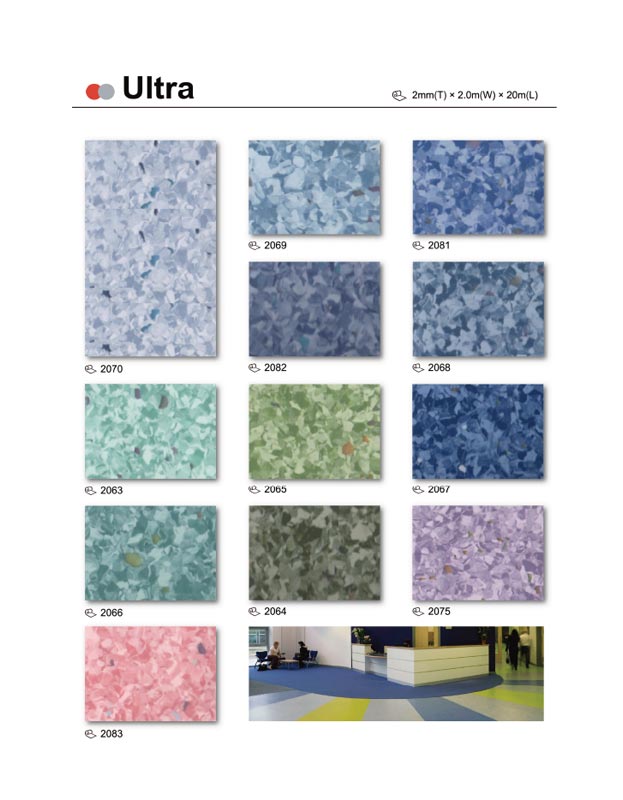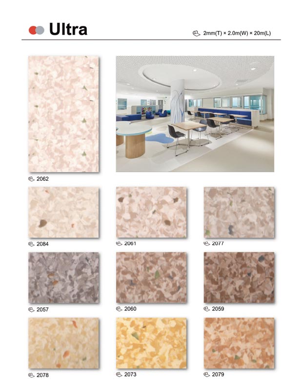 Ultra is a durable, multi-purpose homogeneous vinyl flooring with non-directional designs. It is an ideal solution for heavy traffic areas such as healthcare, education. retail, offices and public buildings. Ultra has a surface treated with PUR reinforcement, which means no wax and no polish for life and excellent life cycles costs. The PUR also provides a good base for future maintenance procedures.
